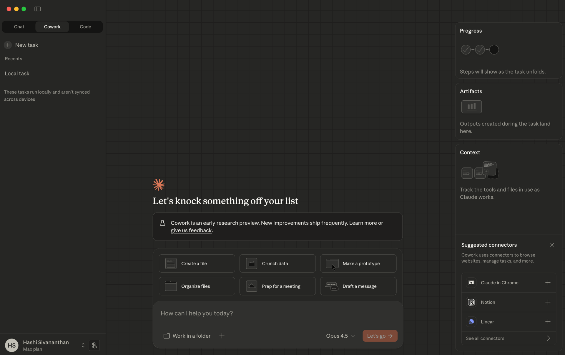 Cowork works differently. You point it at a folder on your Mac, tell it what you need, and walk away. It makes a plan, executes the steps, and checks back in when it hits a decision point or finishes. Anthropic describes the experience as "less like a back-and-forth and more like leaving messages for a coworker."