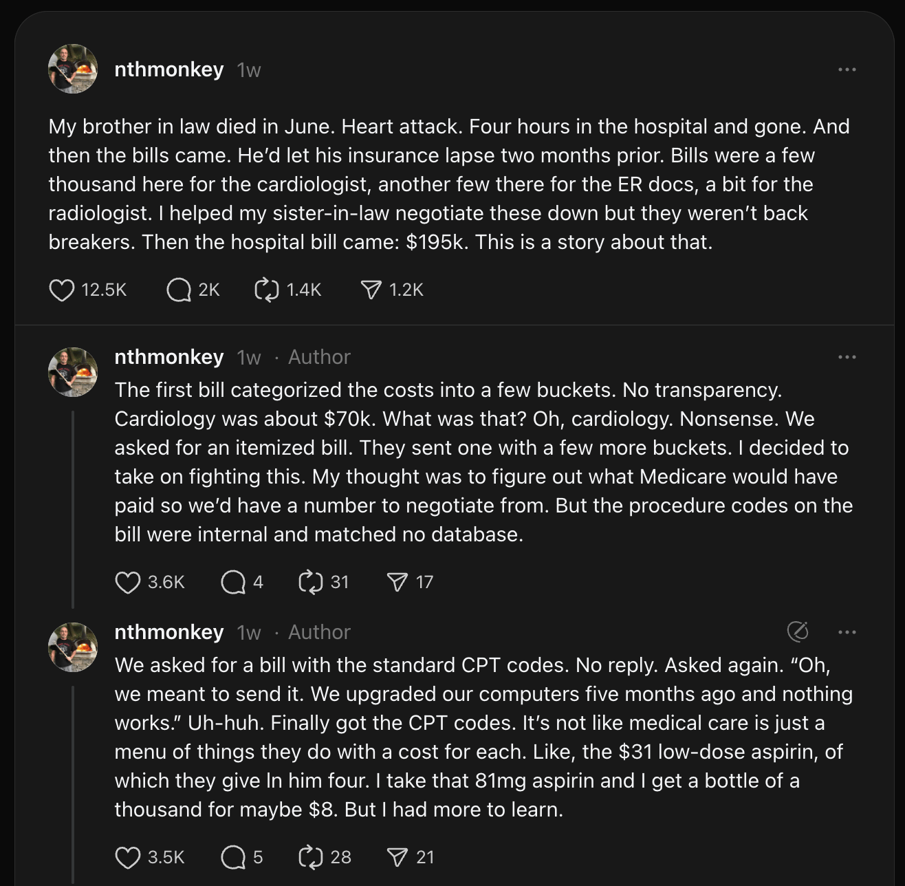 💰 What happened: After a family tragedy, a man received a $195K hospital bill. Using Claude AI to analyze the itemized charges, he found $100K+ in billing violations—double-billing, incorrect codes, and markups up to 2,300%. He negotiated the bill down to $37K.